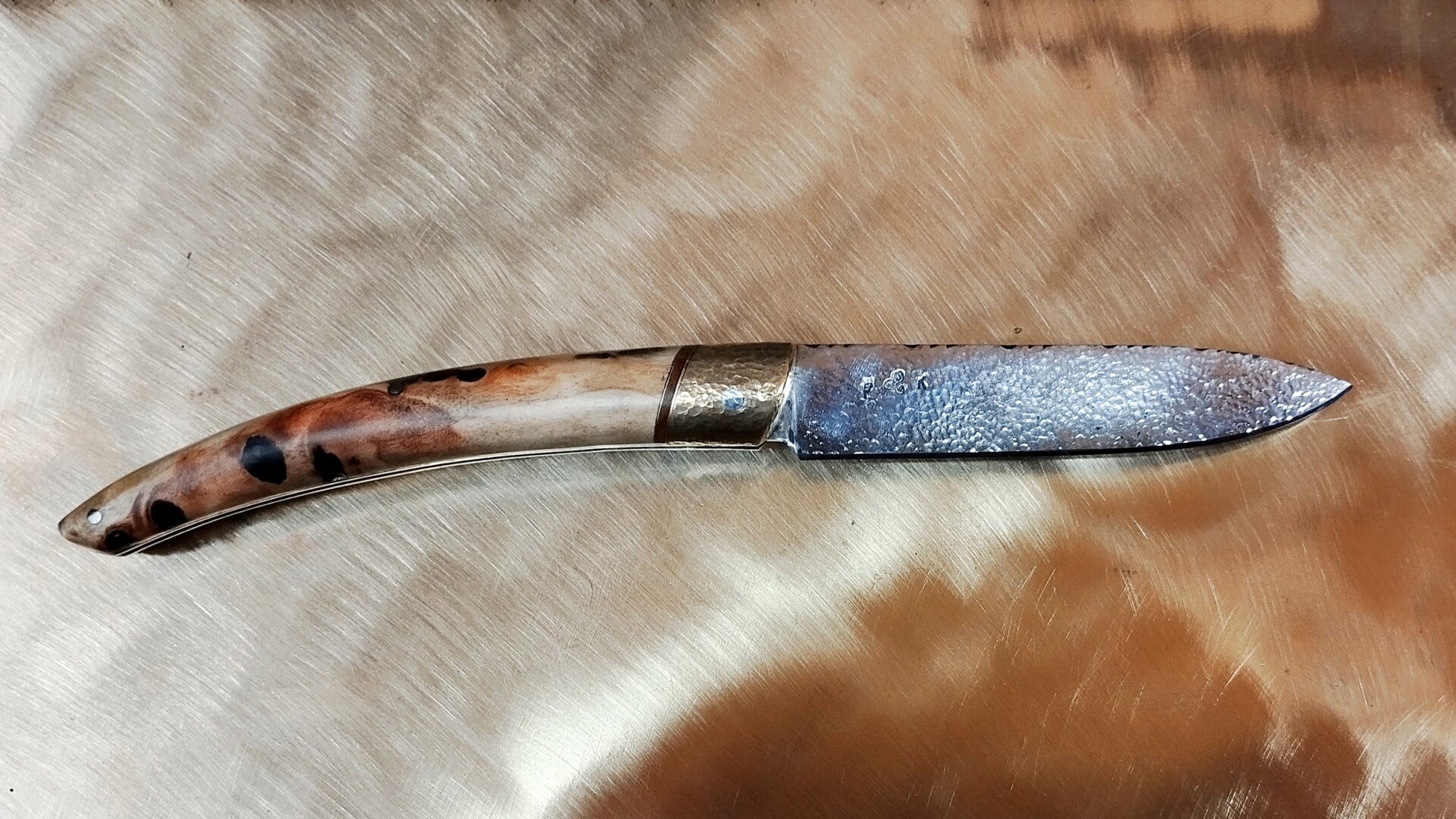 Manche en loupe de peuplier de Lopérec avec intercalaires cuivre, loupe de hêtre et laiton